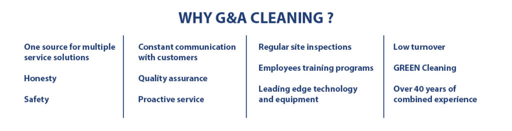 As a provider of janitorial service to over 750 locations throughout Michigan, G&A Cleaning Inc outstanding record of service, quality, safety, and reliability is unparalleled in the commercial cleaning field. Our attention to detail work, quality assurance assistance, training programs, and our emergency response team are unmatched in the industry.